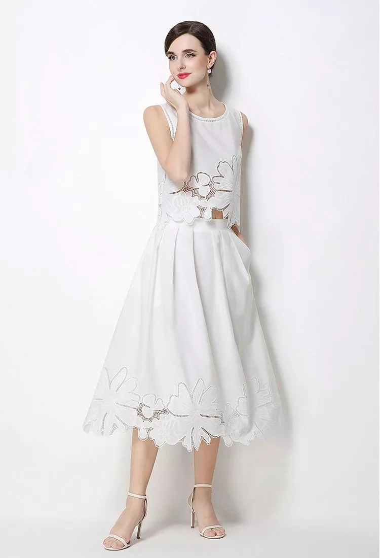 Completo due pezzi dal fascino couture composto da top ricamato coordinato e gonna midi ampia con lavorazione floreale traforata. La linea strutturata valorizza il punto vita mentre il ricamo sangallo dona pregio e leggerezza visiva. Un coordinato sofisticato ideale per cerimonie, eventi, party eleganti e occasioni speciali.