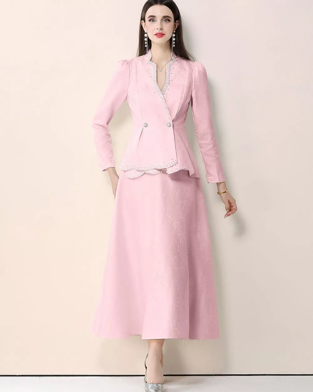 La gonna lunga in tessuto jacquard accompagna il movimento con fluidità, mantenendo una silhouette composta ed elegante. Il colore rosa chiaro rende il set luminoso e versatile, adatto sia a occasioni professionali sia a cerimonie sobrie.