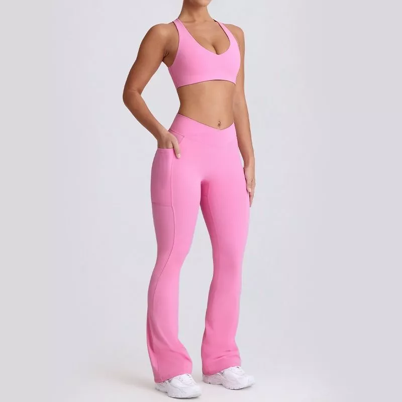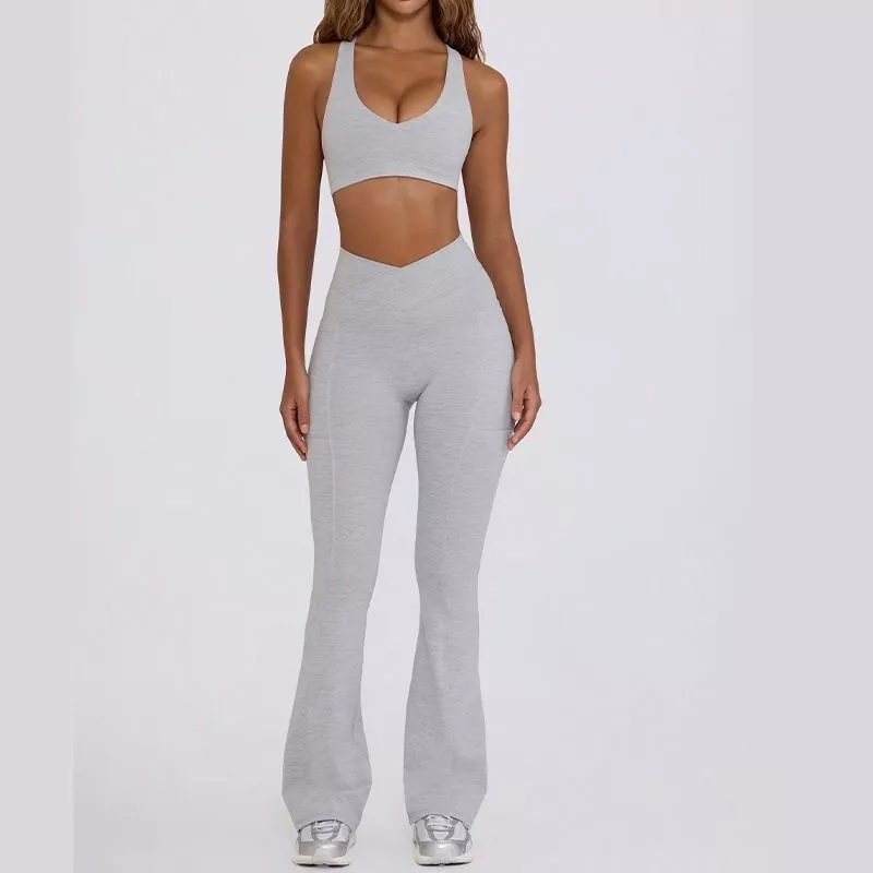 Il set include leggings svasati a vita alta e reggiseno sportivo con supporto medio, realizzati in tessuto elasticizzato che segue i movimenti del corpo senza costrizioni.