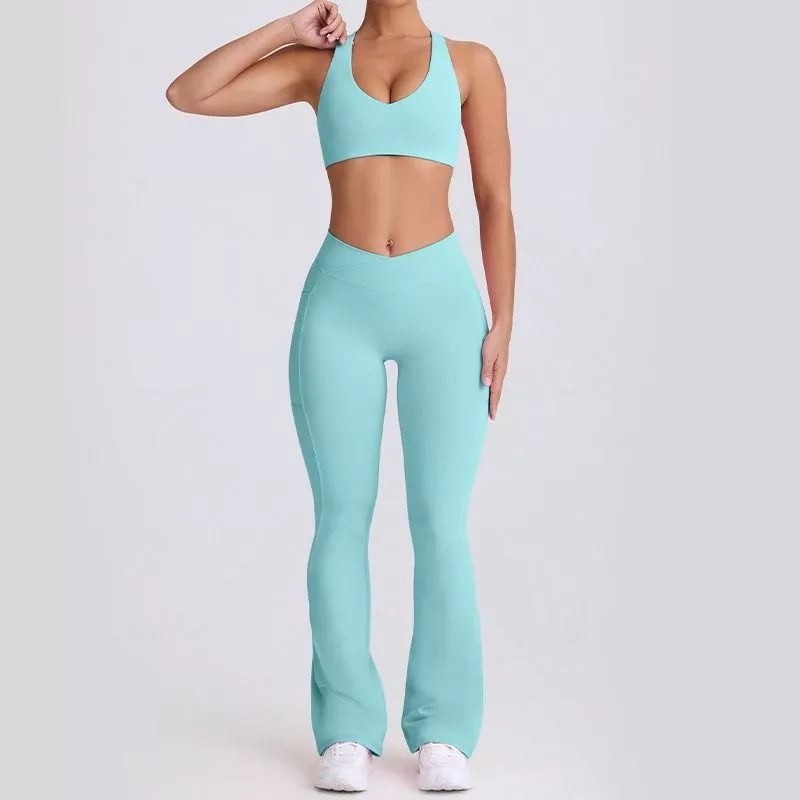 La linea flare (gamba leggermente svasata) slancia visivamente la figura, mentre la fascia alta in vita migliora stabilità e vestibilità. Il bra garantisce sostegno e libertà nei movimenti, rendendolo adatto sia per attività leggere che per uso quotidiano.