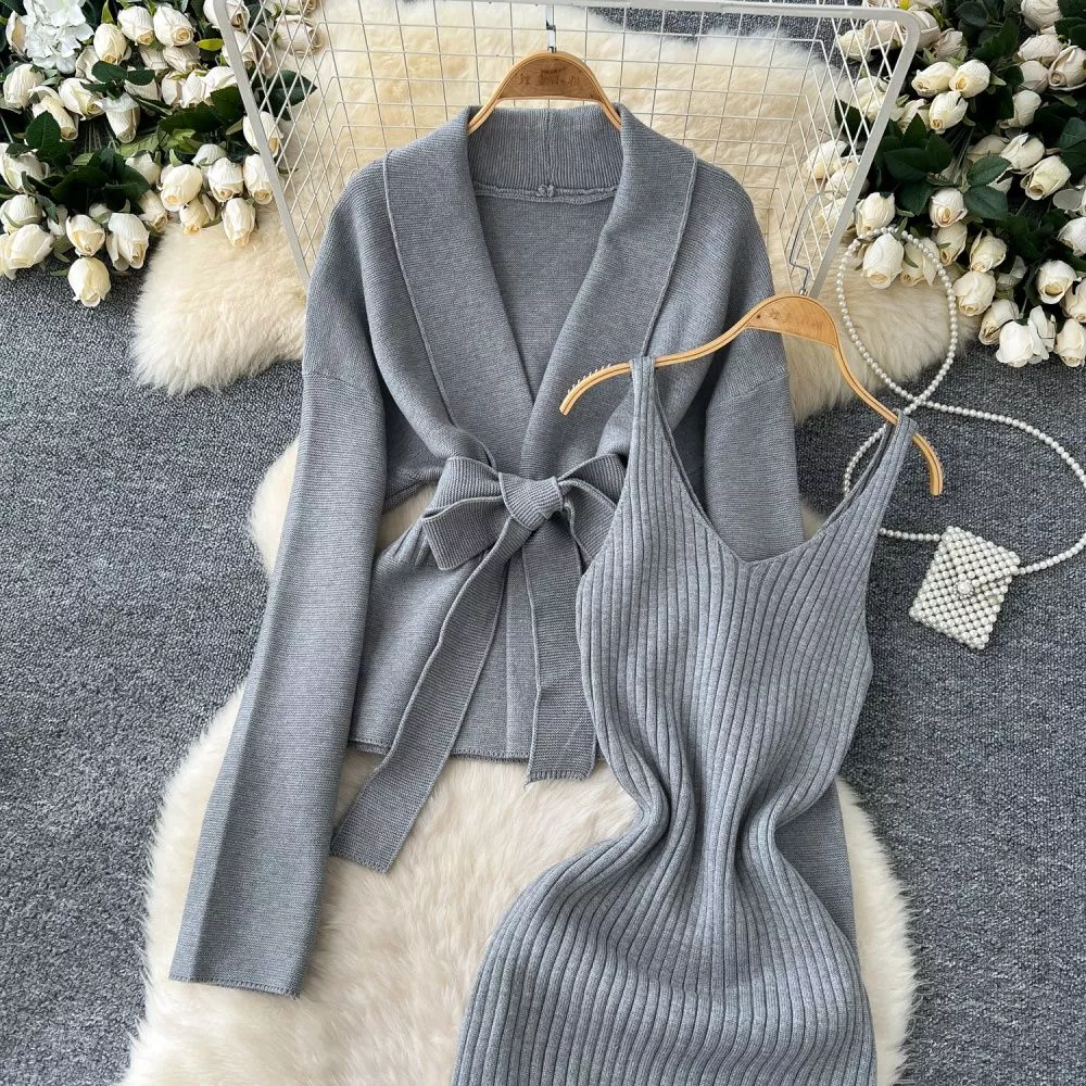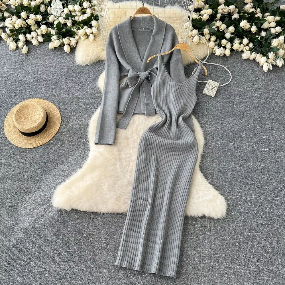 Set Vestito Abito Lungo Donna Morbido Maglia Basico Grigio Coste Cardigan 25975