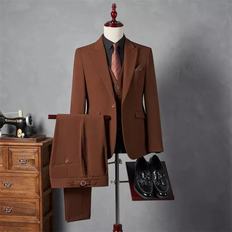 Smoking Completo Set Uomo Tre Pezzi Giacca Gilet Slim Pantaloni Marrone ACB583