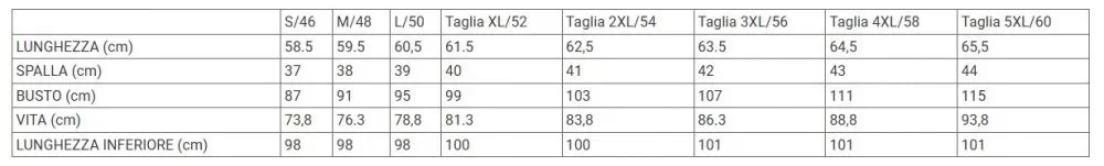 | S/46 | M/48 | L/50 | Taglia XL/52 | Taglia 2XL/54 | Taglia 3XL/56 | Taglia 4XL/58 | Taglia 5XL/60 | |