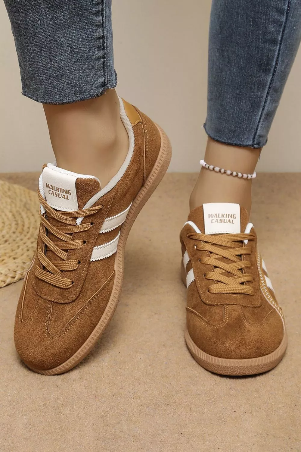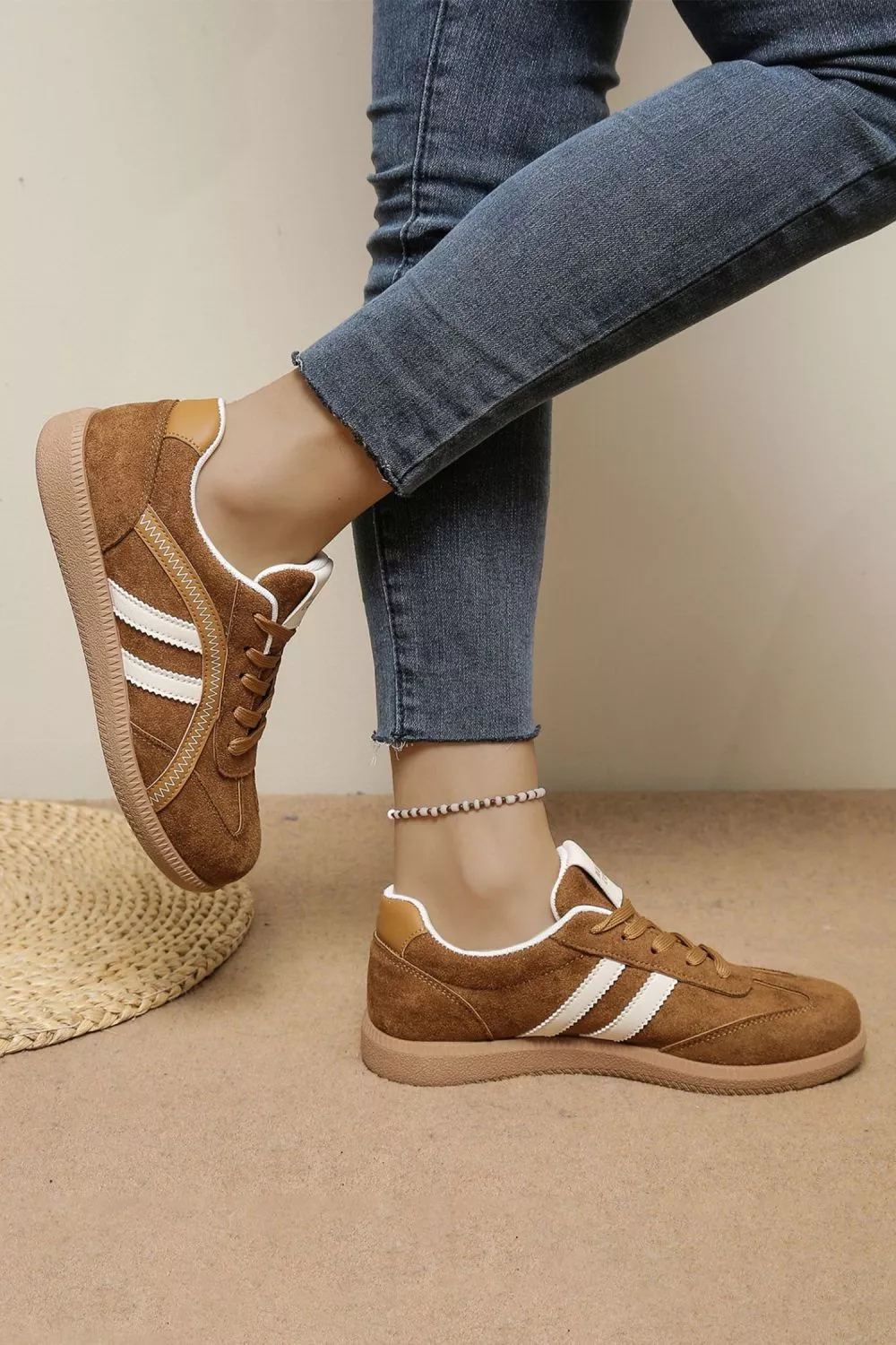 Sneakers da donna color cammello in stile casual, caratterizzate da una finitura effetto scamosciato che dona un look caldo e raffinato. Il design stringato e la suola bassa garantiscono comfort e stabilità durante tutta la giornata. Versatili e facili da abbinare, sono perfette per completare outfit quotidiani con un tocco moderno e curato.