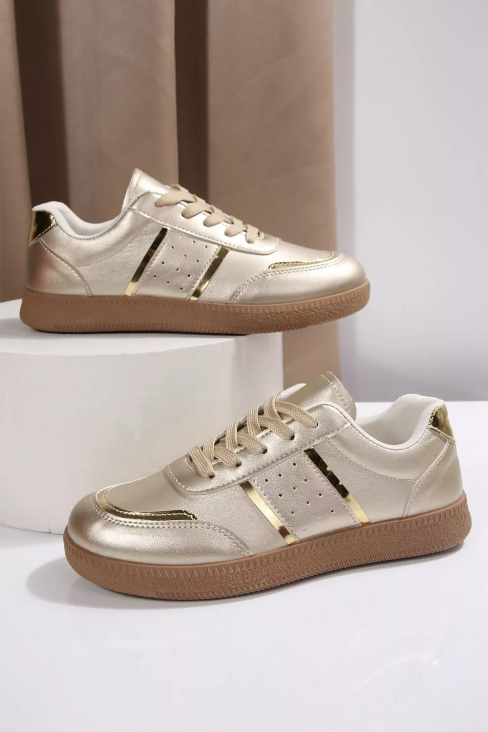 Sneakers da donna effetto oro metallizzato dal design pulito ed elegante, perfette per chi cerca uno stile raffinato ma versatile. Le linee essenziali e la finitura luminosa valorizzano ogni outfit, mentre la suola confortevole le rende ideali per l’uso quotidiano. Un modello casual chic facile da abbinare e sempre attuale.