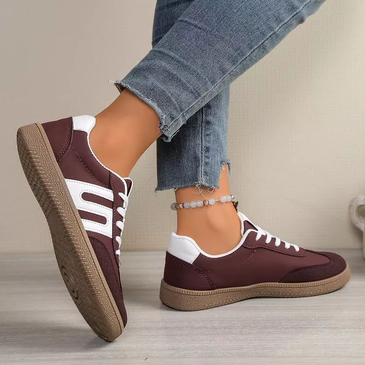 Sneakers color vinaccia con dettagli bianchi e suola beige, dal design retrò e versatile. Realizzate in tessuto sintetico morbido e traspirante, offrono comfort e leggerezza in ogni passo. Il profilo basso e la linea sportiva le rendono perfette per look casual o streetwear, ideali da abbinare a jeans, gonne o pantaloni cropped per uno stile moderno e disinvolto.