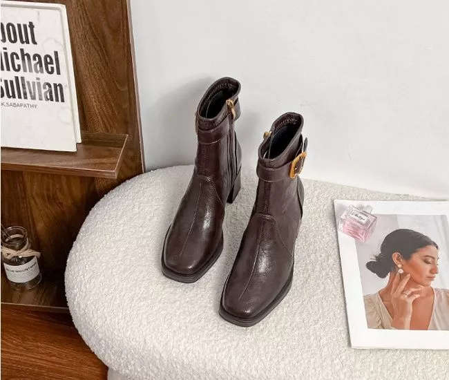 Stivaletti Donna Eleganti Tacco Largo 7 cm Marrone Con Fibbia CF68092