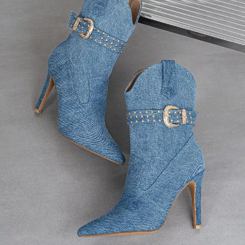 Stivaletti donna dal design deciso e femminile, realizzati in tessuto denim con lavorazione effetto jeans. Il modello presenta una silhouette slanciata con punta affusolata e tacco a spillo da 10 cm, pensato per valorizzare la figura. Il cinturino con fibbia e micro borchie aggiunge carattere al look, rendendo questi stivaletti ideali per outfit serali, eventi o abbinamenti fashion di forte impatto.