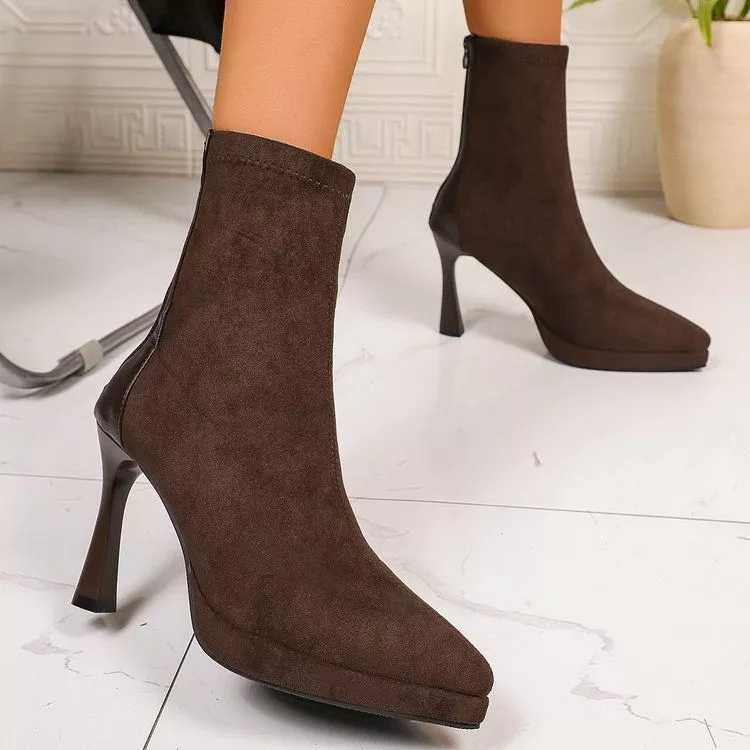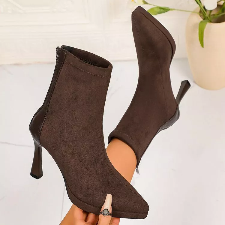 Stivaletti eleganti da donna pensati per valorizzare outfit raffinati e femminili. Il design essenziale con finitura effetto velluto dona un aspetto sofisticato, ideale per la sera, l'ufficio o occasioni formali. Il tacco alto da 10 cm slancia la figura, mentre la zip laterale consente una calzata pratica e ordinata. Un modello versatile, perfetto da abbinare ad abiti, gonne midi e pantaloni eleganti.