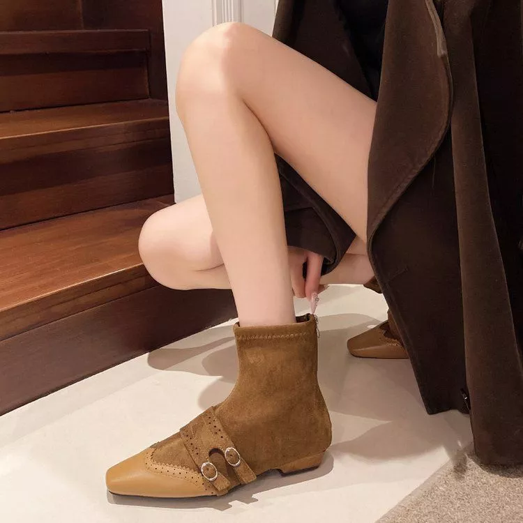 Stivaletti eleganti da donna caratterizzati da una linea compatta e raffinata, ispirata allo stile francese. Il design presenta una punta squadrata ben definita che dona carattere alla calzatura, mantenendo un'estetica pulita e contemporanea. Il cinturino frontale con doppia fibbia decorativa aggiunge un dettaglio distintivo, valorizzando la tomaia senza appesantire la silhouette.