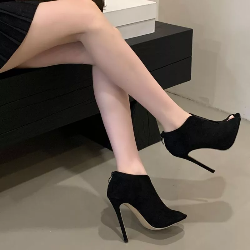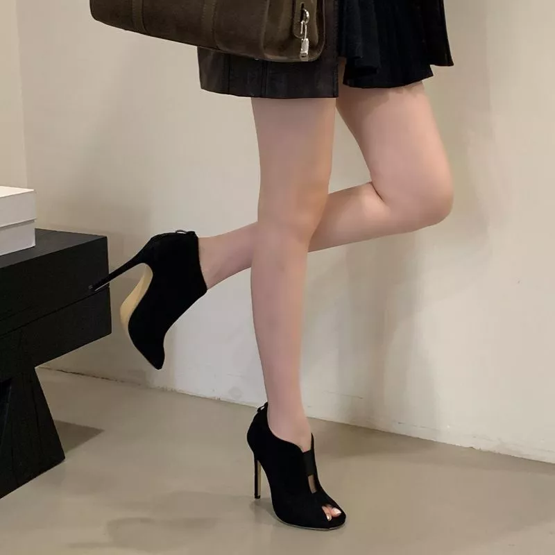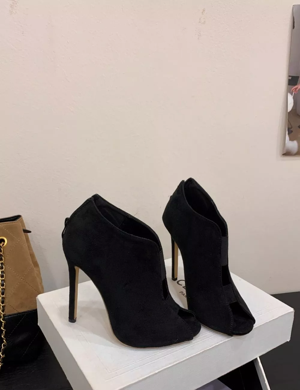 Stivaletti Eleganti Tacco 11 Cm Design Aperto Davanti Nero Scamosciato CF60339