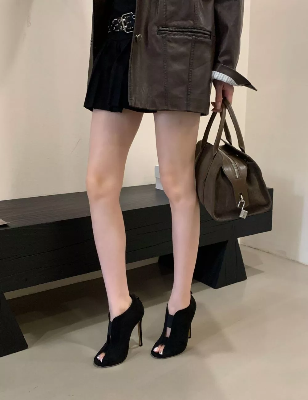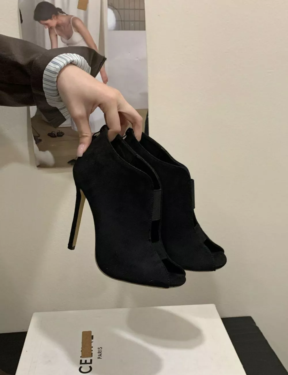 Stivaletti eleganti dal design moderno, caratterizzati da una linea affusolata e da un’apertura frontale che dona un tocco sofisticato al look. Il materiale in pelle sintetica con effetto scamosciato valorizza la silhouette del piede e si abbina facilmente a outfit serali ed eleganti. Il tacco sottile da 11 cm slancia la figura, rendendo il modello ideale per eventi, serate e combinazioni fashion dall’estetica ricercata.