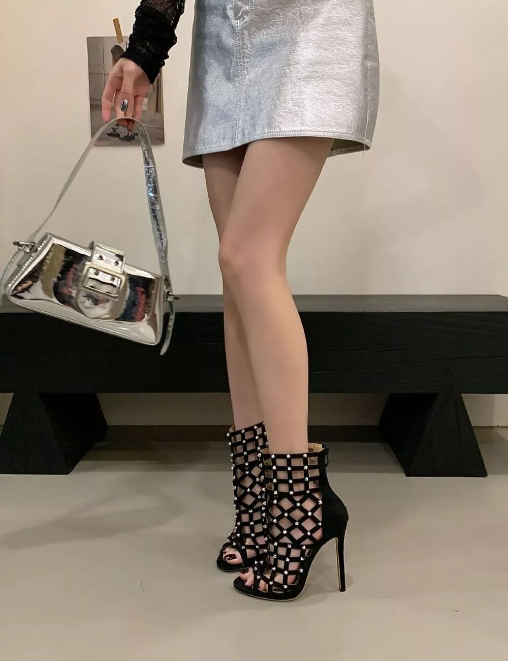 Stivaletti eleganti dal design traforato, pensati per valorizzare la silhouette con un effetto moderno e ricercato. La struttura in materiale sintetico assicura stabilità e comfort, mentre il tacco di 11 cm slancia la gamba con un profilo affusolato.