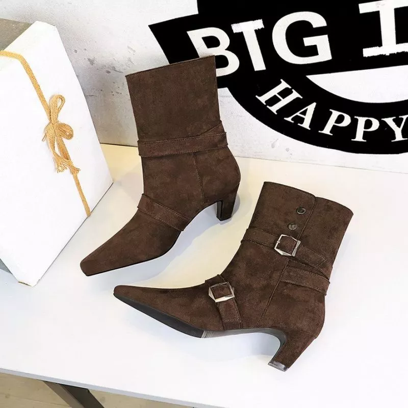 Stivaletti Marrone Scuro Tacco 5 Cm Punta Affusolata Con Cinturini Donna CF60314