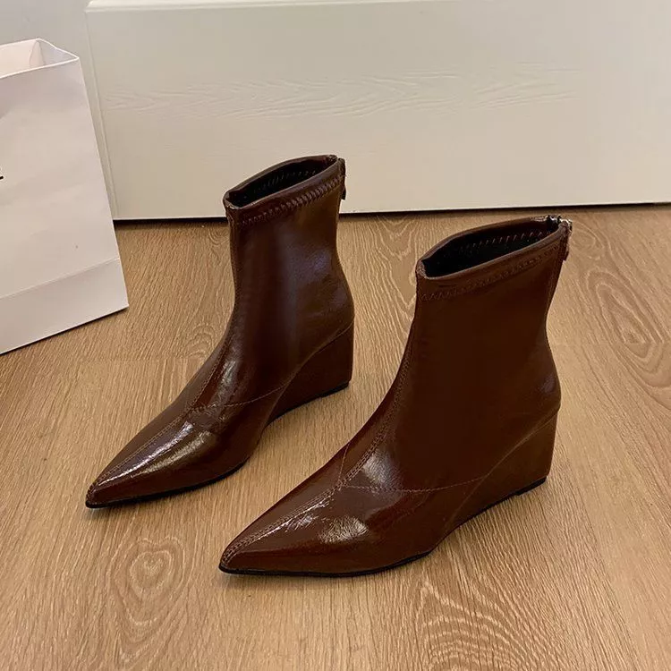 Stivaletti corti in pelle sintetica lucida con tacco interno da 7 cm, ideali per slanciare la figura mantenendo il massimo comfort.