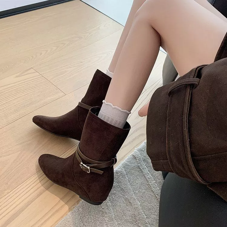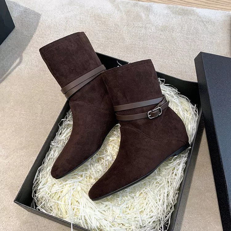 Stivaletti corti da donna in pelle sintetica effetto scamosciato, morbidi e avvolgenti. Il design con zeppa interna da 5 cm slancia la figura mantenendo il massimo comfort, mentre il cinturino con fibbia laterale aggiunge un dettaglio moderno e raffinato. Perfetti per outfit casual o eleganti, si abbinano facilmente a gonne midi, jeans o pantaloni slim per look autunnali chic e confortevoli.