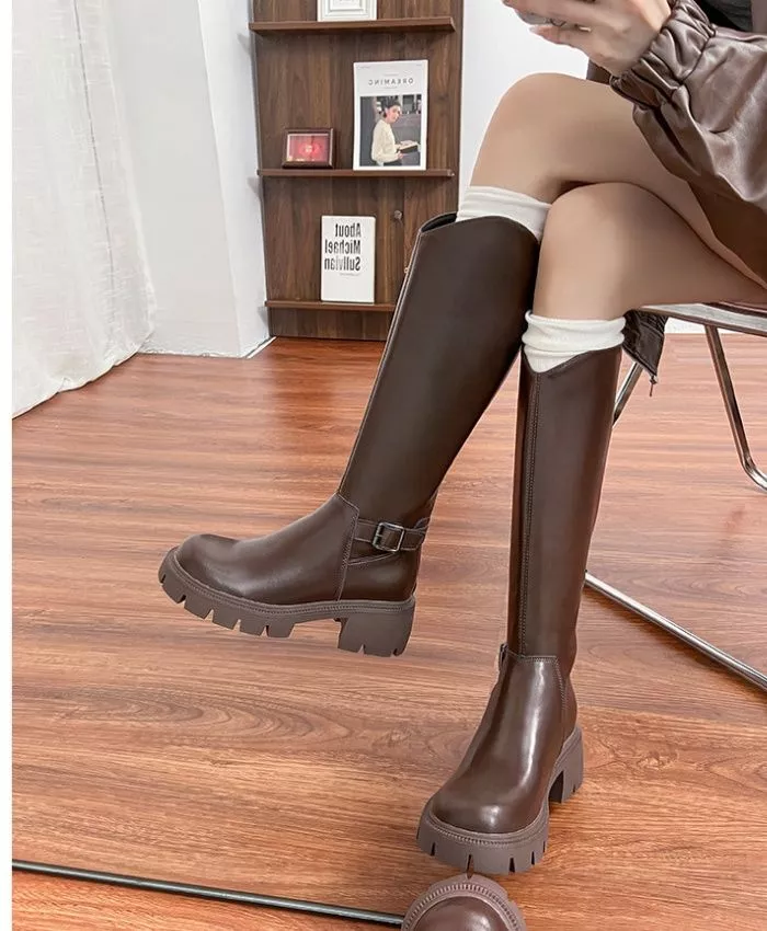 Stivali Al Ginocchio Marroni Con Suola Carrarmato E Fibbie Look Attuale CF60439