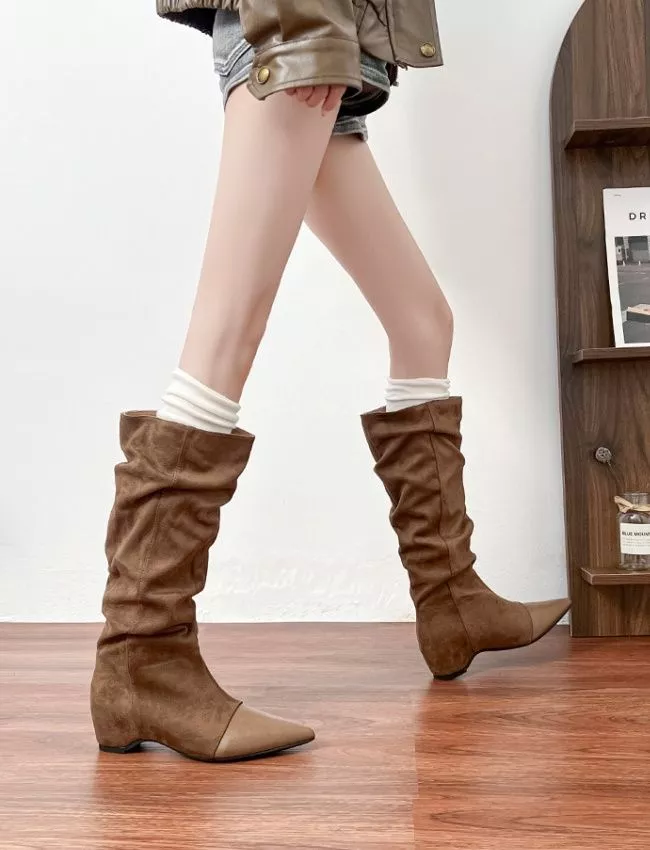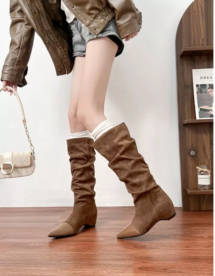 Stivali alti con punta affusolata e gambale morbido effetto arricciato, pensati per un look moderno e femminile. Il tacco da 5,5 cm offre comodità e slancio, accompagnando la camminata con stabilità. La pelle sintetica conferisce un aspetto elegante e versatile, mentre la struttura morbida del gambale valorizza la gamba con un effetto raffinato. Perfetti per outfit autunnali e serali, si abbinano a gonne, vestiti e pantaloni aderenti per uno stile contemporaneo e ricercato.