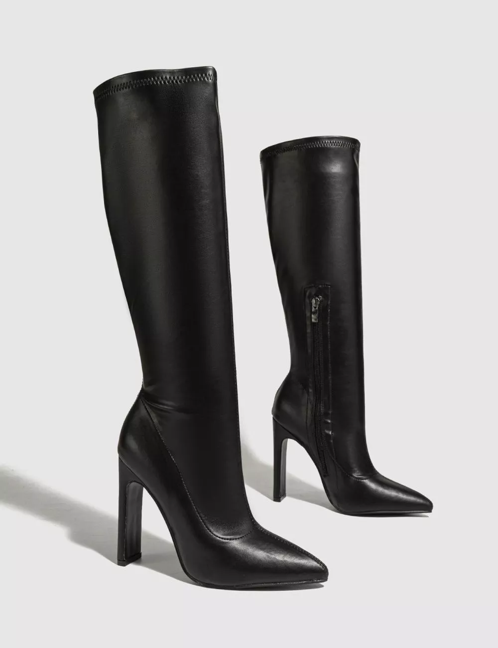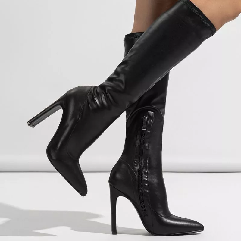 Stivali alti da donna in pelle sintetica morbida, con punta affusolata e tacco alto da 11 cm.