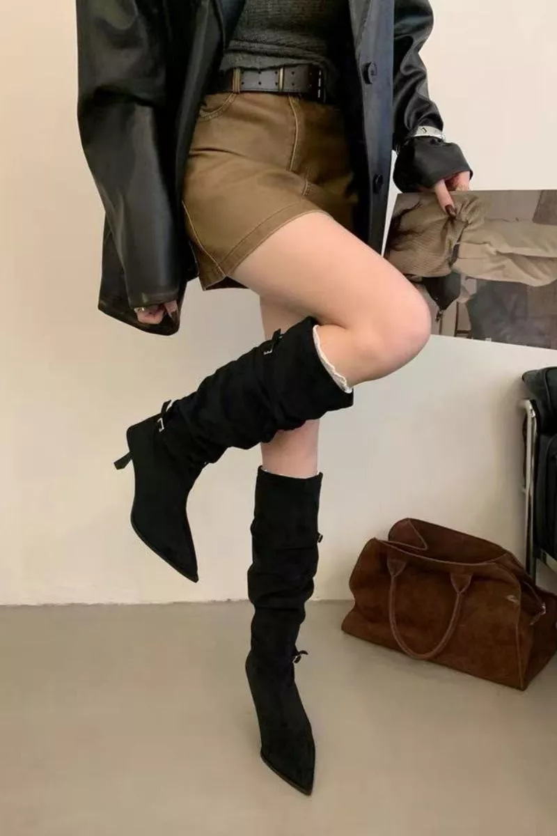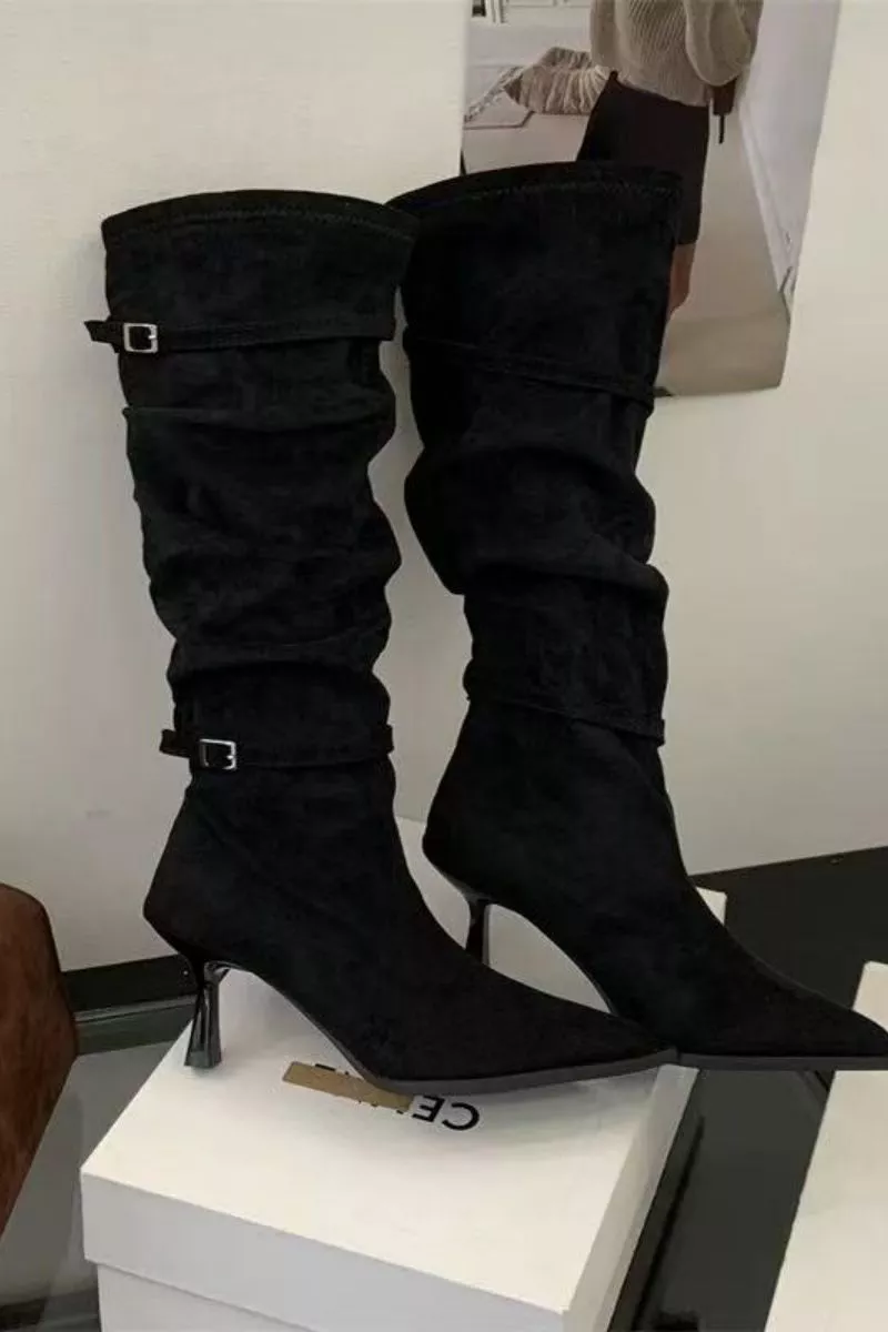 Stivali alti in pelle sintetica effetto scamosciato, con punta affusolata e tacco sottile di 8 cm.