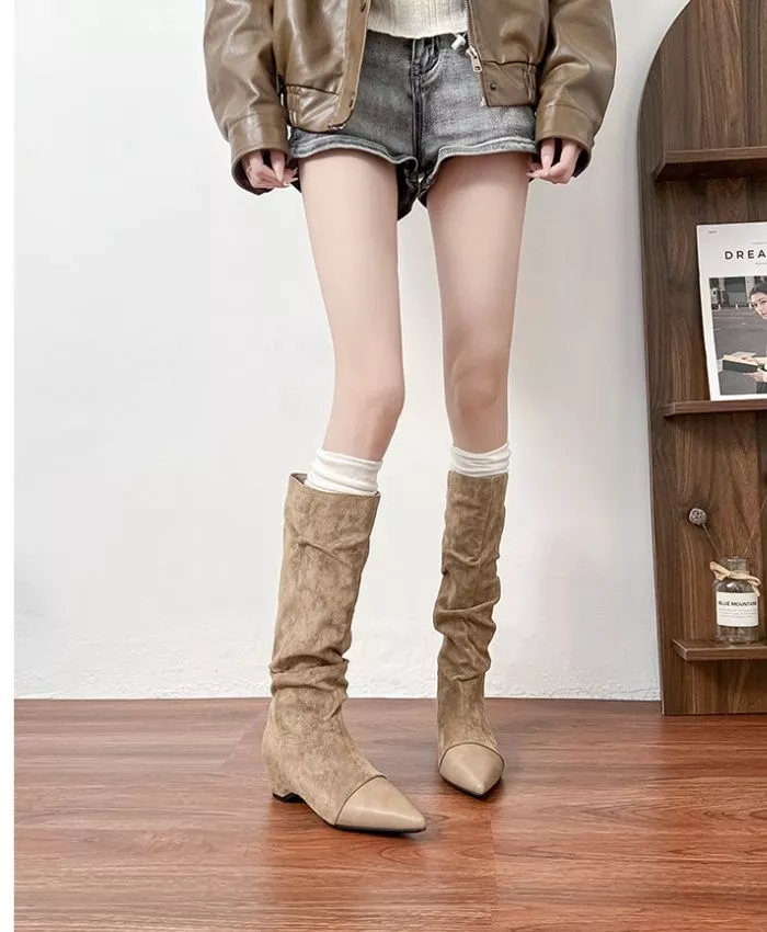 Stivali alti con punta affusolata e gambale morbido effetto arricciato, pensati per un look moderno e femminile. Il tacco da 5,5 cm offre comodità e slancio, accompagnando la camminata con stabilità. La pelle sintetica conferisce un aspetto elegante e versatile, mentre la struttura morbida del gambale valorizza la gamba con un effetto raffinato. Perfetti per outfit autunnali e serali, si abbinano a gonne, vestiti e pantaloni aderenti per uno stile contemporaneo e ricercato.