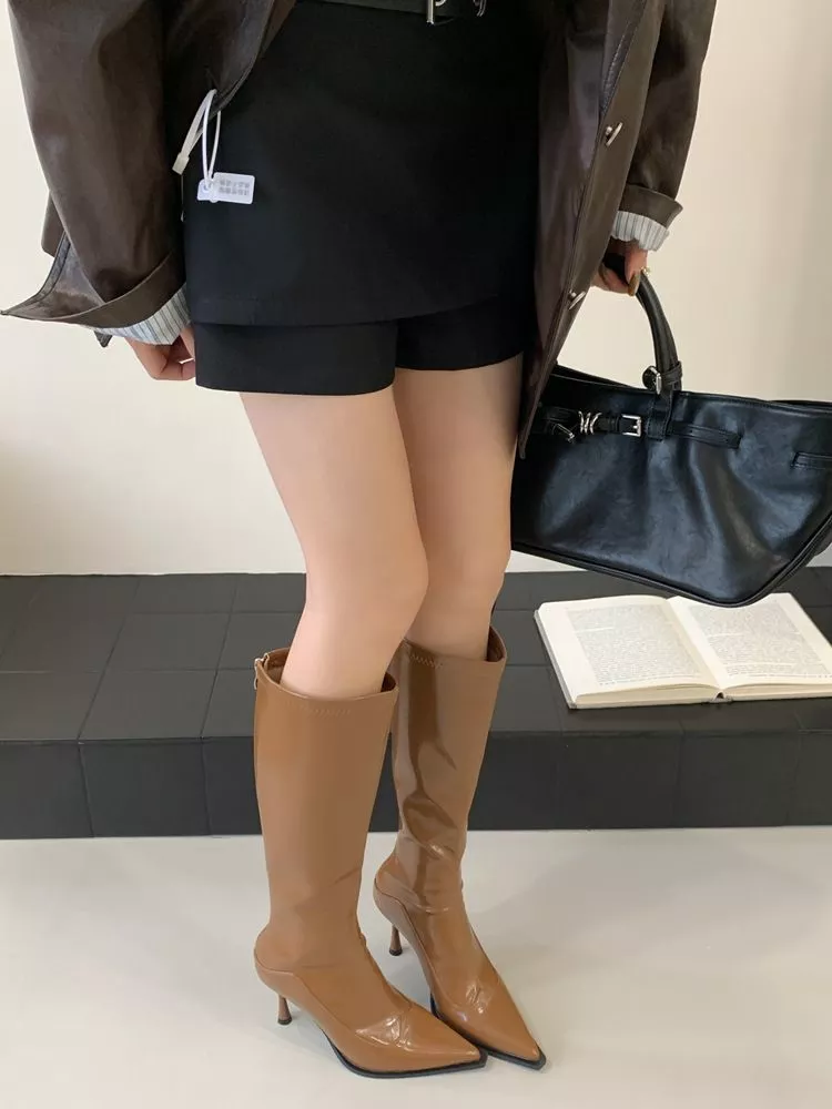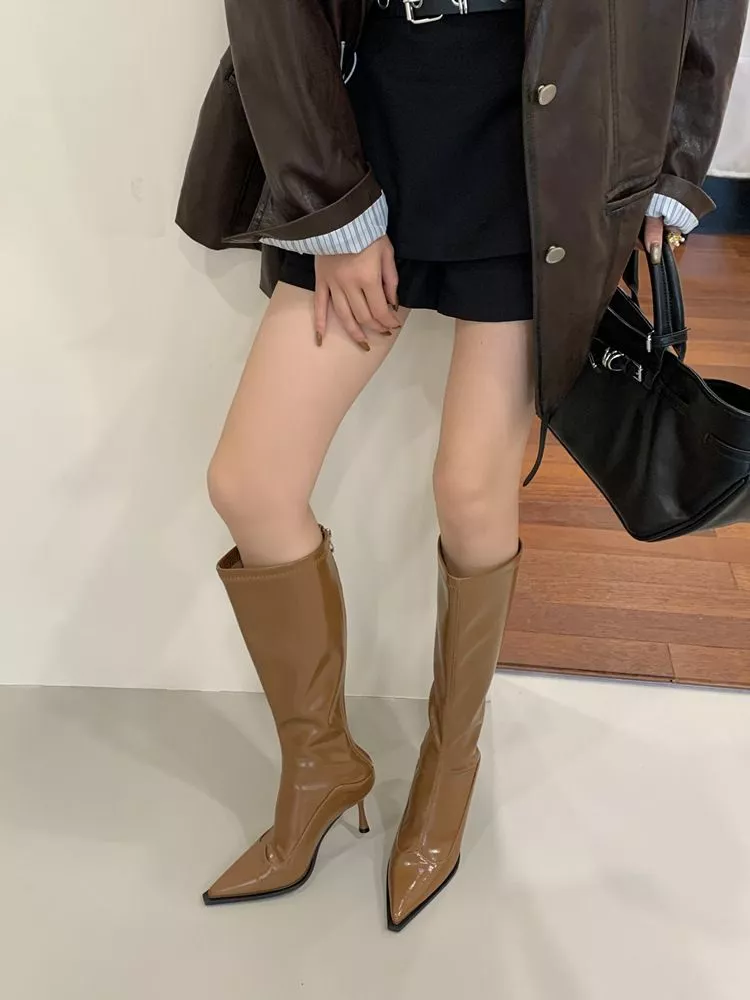 Stivali Cognac Lucidi A Punta Tacco 7 Cm Al Ginocchio In Pelle Sintetica CF56856