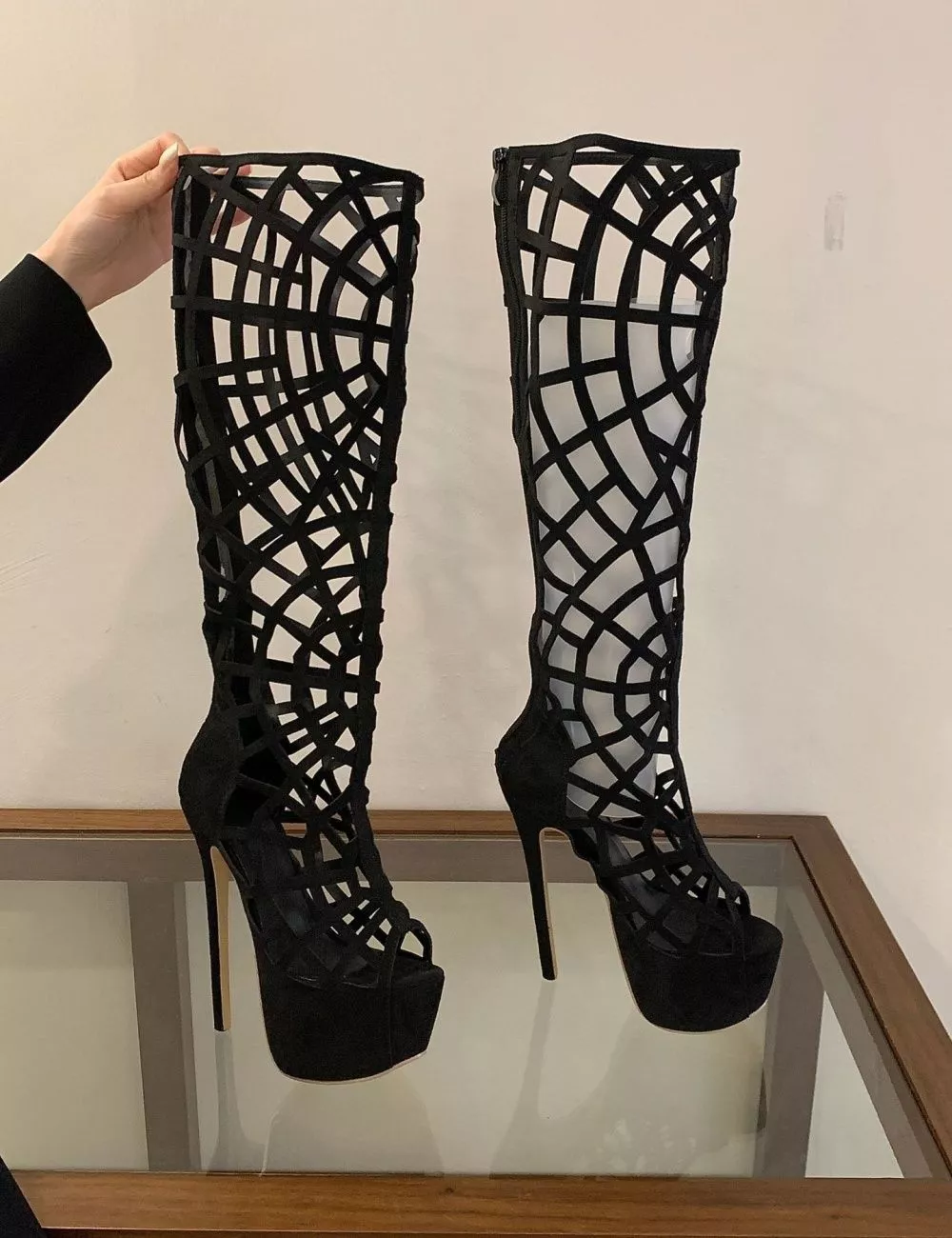 Stivali donna al ginocchio dal design traforato a gabbia, pensati per look serali d’impatto. Il plateau anteriore equilibra il tacco a spillo 17 cm, slanciando la figura e valorizzando la gamba. Ideali per eventi, outfit fashion audaci e serate dove vuoi un effetto scenico immediato.