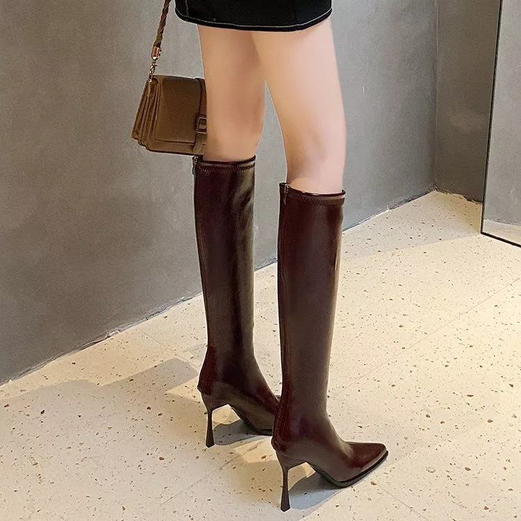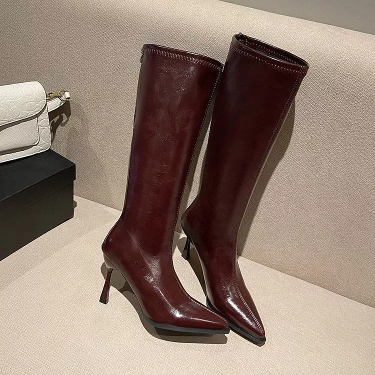Stivali alti da donna dal design elegante e moderno, realizzati in pelle sintetica liscia con finitura lucida che valorizza la silhouette della gamba. La punta affusolata e il tacco sottile di 6,5 cm slanciano la figura con un effetto raffinato, ideale per look femminili e di forte impatto. La linea pulita, il gambale strutturato e la forma affilata donano uno stile chic e contemporaneo, perfetto per outfit da sera, eventi speciali o per dare carattere alle combinazioni quotidiane. Un modello versatile e sofisticato, pensato per chi desidera uno stivale slanciato e altamente valorizzante.