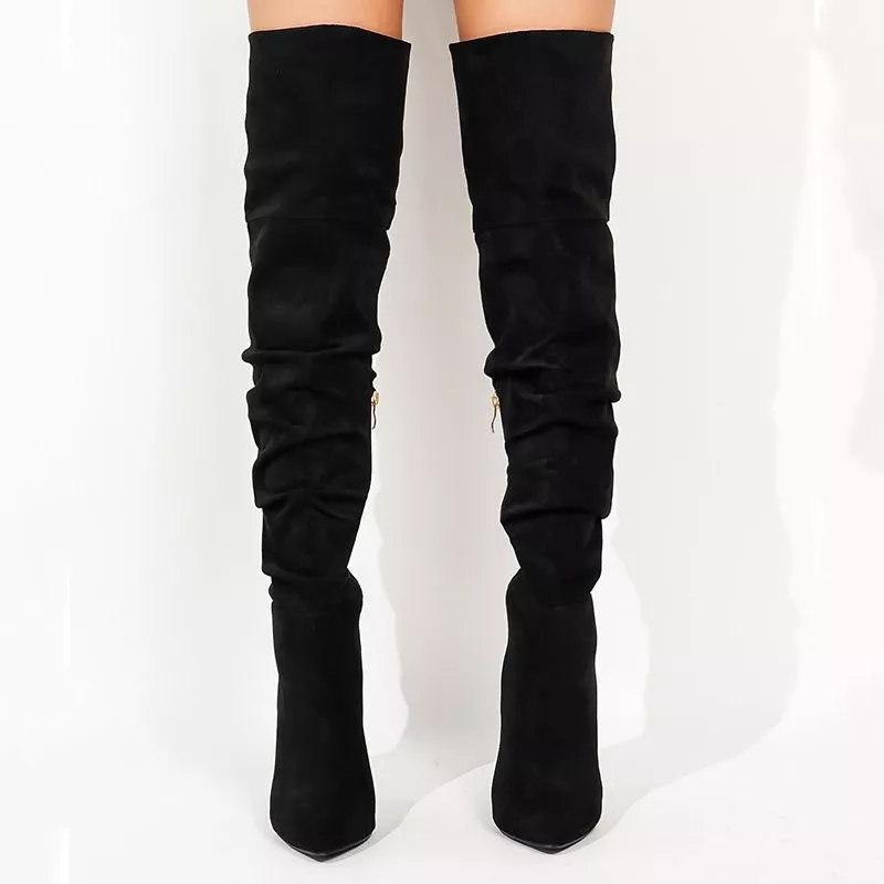 Il modello overknee con punta affusolata dona un tocco sofisticato, mentre il tacco alto a spillo esalta la silhouette con un’eleganza decisa. La texture effetto camoscio morbido e le leggere arricciature sulla gamba rendono lo stivale moderno e di forte impatto visivo.