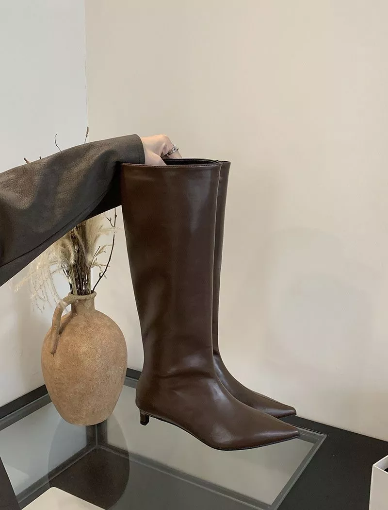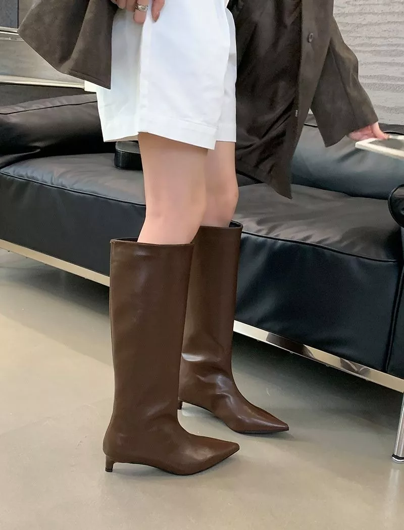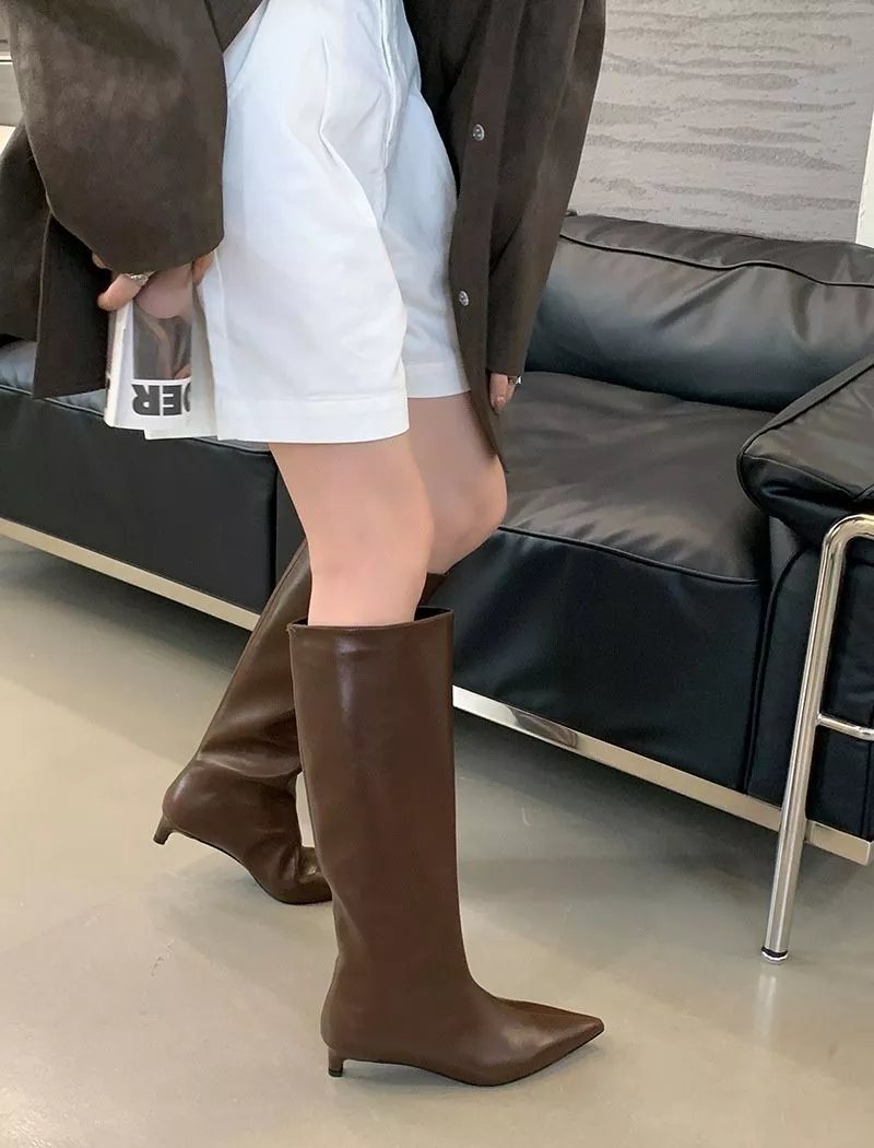 Stivali da donna dal design elegante e contemporaneo, realizzati in pelle sintetica liscia e caratterizzati da una punta affusolata che slancia la gamba con raffinatezza.