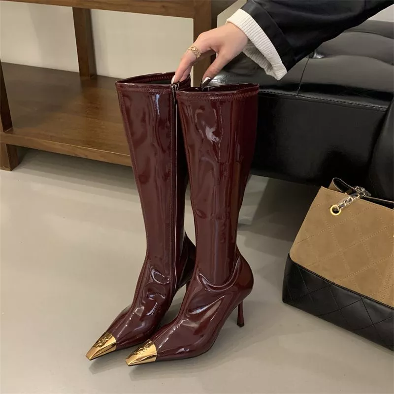Stivali eleganti e seducenti dal design contemporaneo, realizzati in pelle sintetica lucida effetto vernice con raffinata punta dorata metallica.