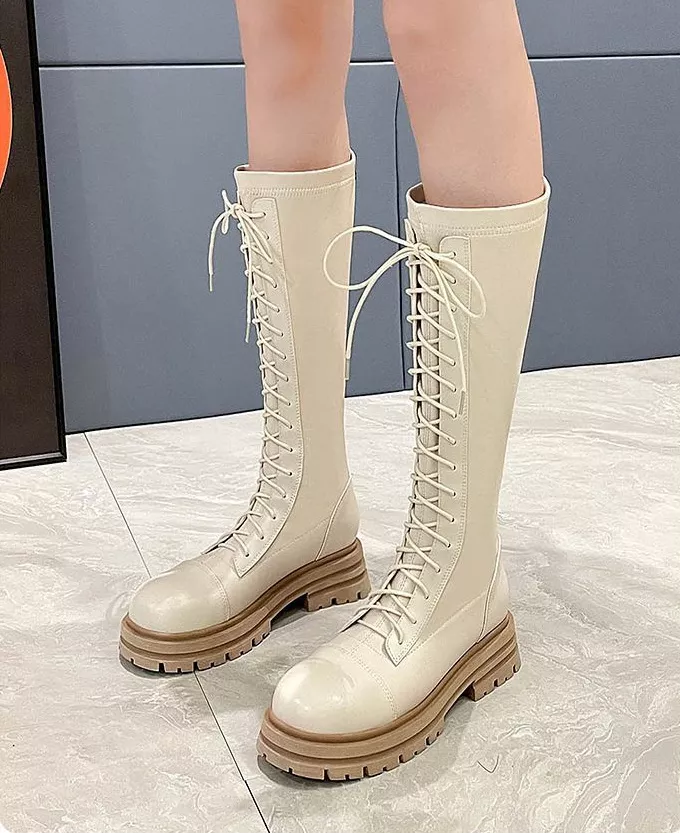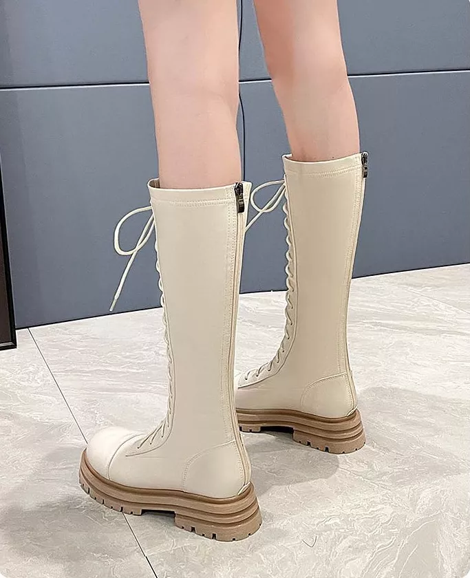 Stivali Scarpe Anfibi Alti 5 Bianco Beige Lacci Platform Pelle Sintetica 40705