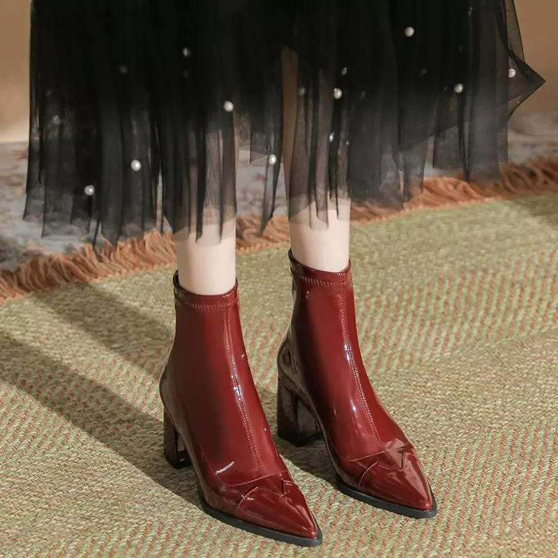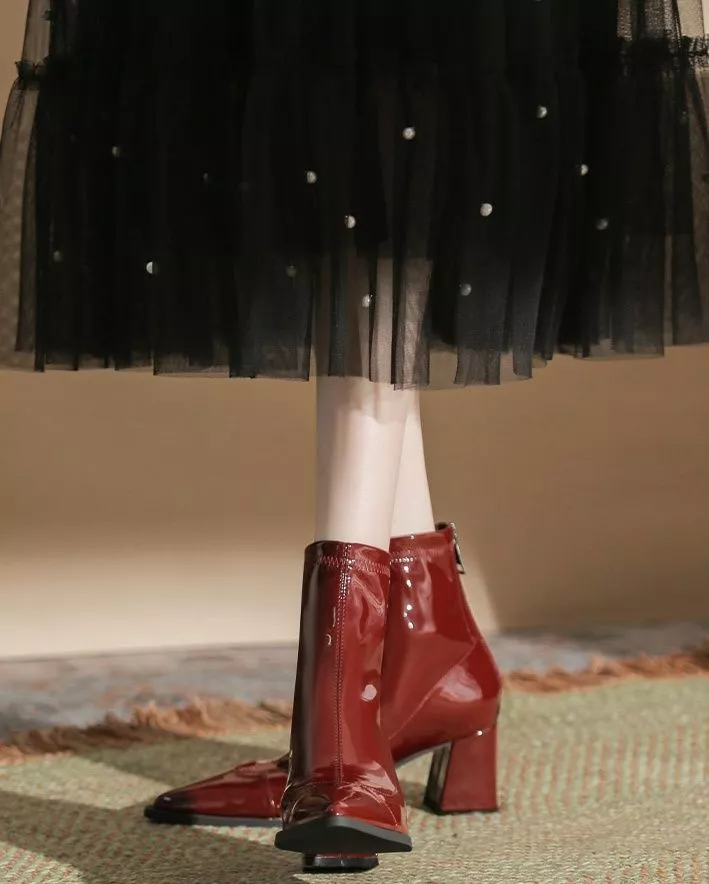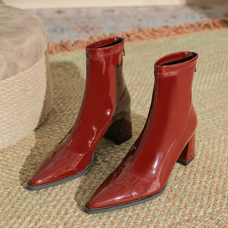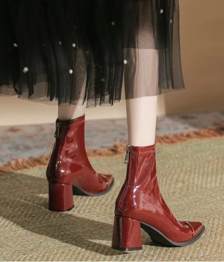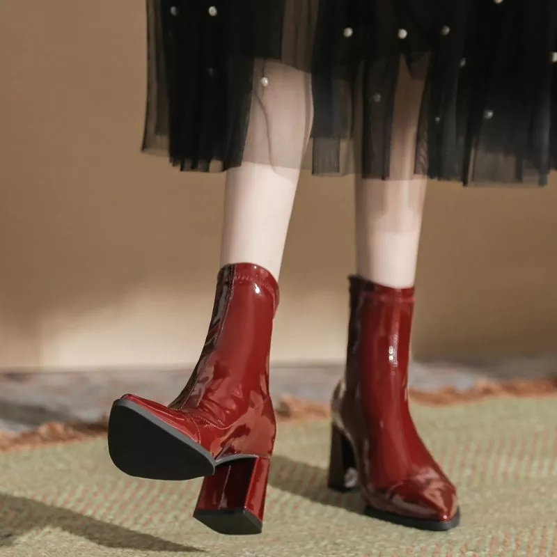 Stivali Scarpe Stivaletti Tronchetto Rosso Lucido 6 cm Pelle Sintetica 81958