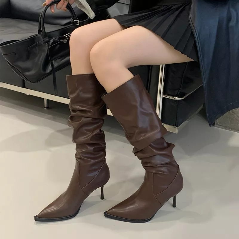 Stivali Alti Cammello A Punta Tacco 7 Cm Moda Autunno Inverno CF51420