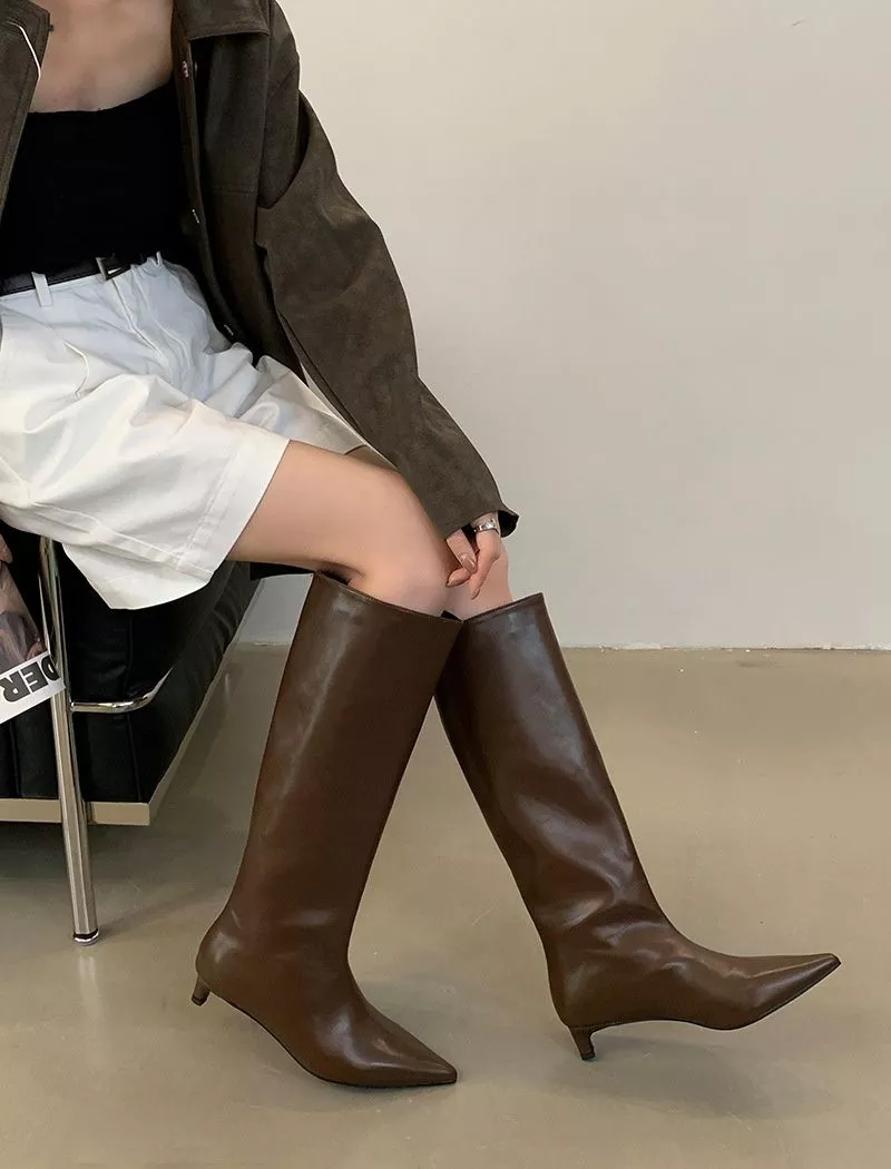 Stivali Alti Donna Punta Stretta Tacco Basso Pelle Sintetica Marrone CF55769