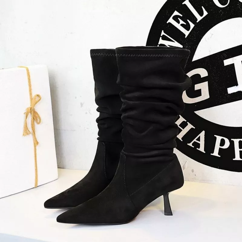 Stivali Donna Neri Al Ginocchio Effetto Camoscio Punta Slim Tacco 4 Cm CF62124