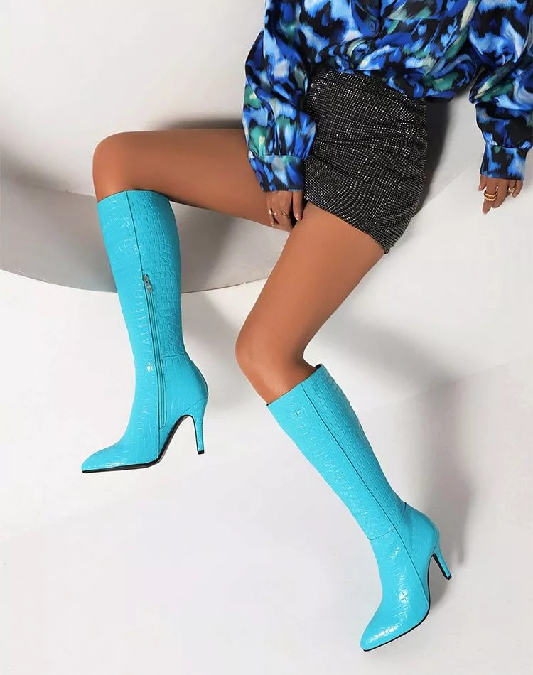 Questi stivali alti effetto coccodrillo sono pensati per valorizzare la gamba con una linea slanciata, una punta affusolata moderna e un tacco sottile da 8,5 cm che dona eleganza senza rinunciare alla stabilità. Il design a tubo alto si appoggia perfettamente alla gamba, creando un look femminile e deciso, ideale per outfit da giorno o da sera. La pelle sintetica lucida esalta le texture a rilievo e dà un tocco glamour immediato, perfetto con gonne, abiti e shorts. Uno stivale d'impatto che completa qualsiasi look con carattere e stile.