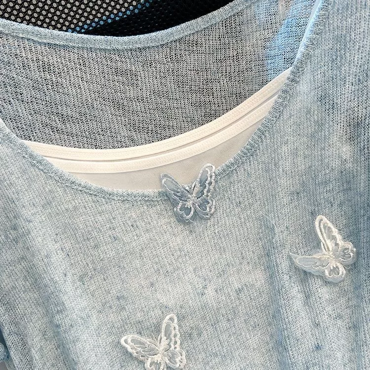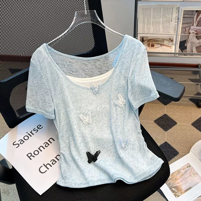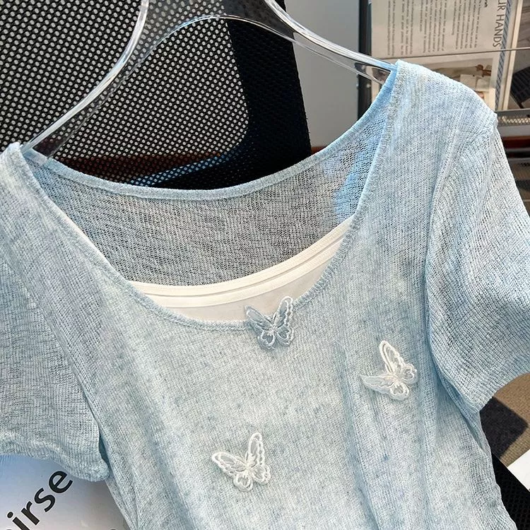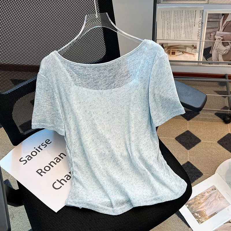 T-shirt femminile e versatile, realizzata in maglia sottile e traspirante, perfetta per la stagione calda. Il taglio slim fit e lo scollo ampio mettono in risalto la silhouette con delicatezza, mentre il tessuto morbido e leggermente trasparente dona un effetto leggero e arioso. Facile da abbinare sia con pantaloni che con gonne per un look casual ma curato.