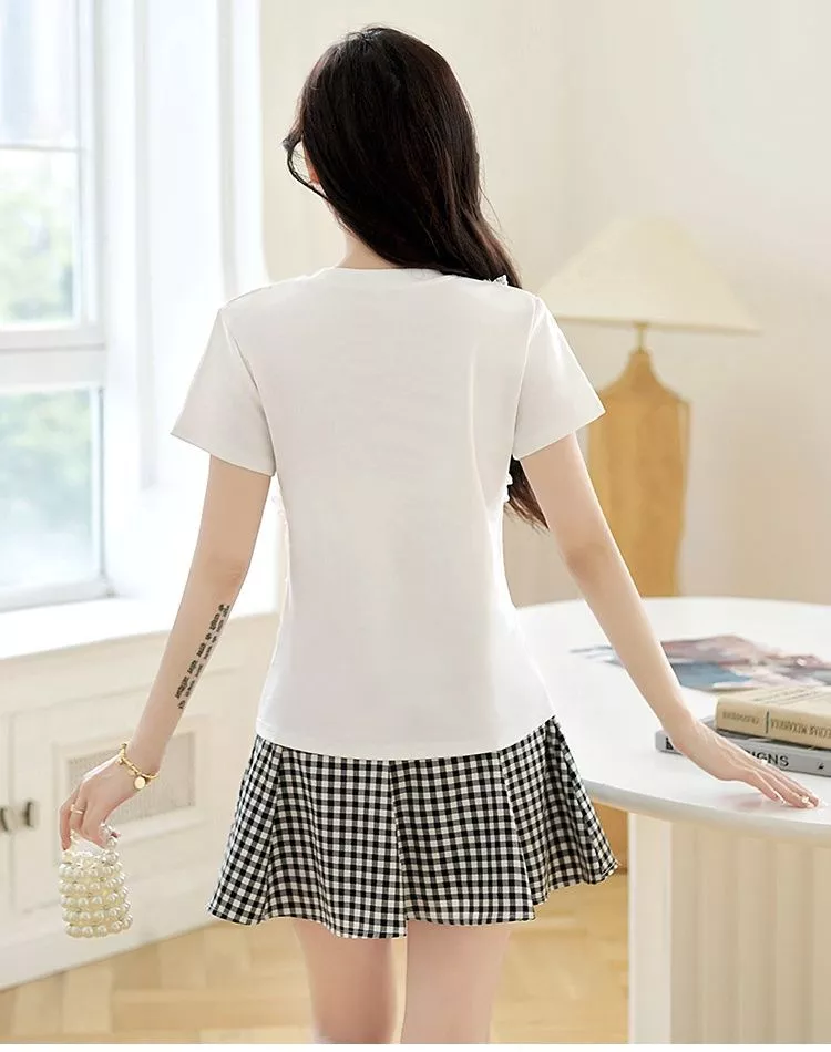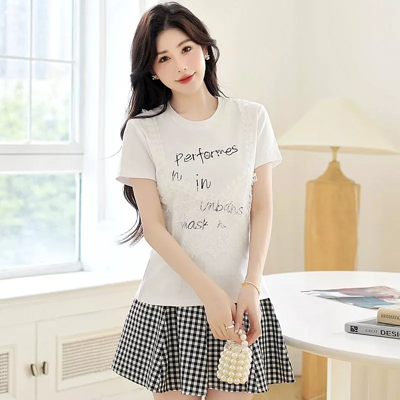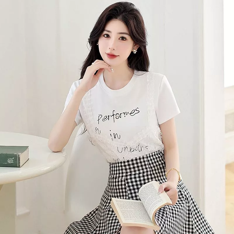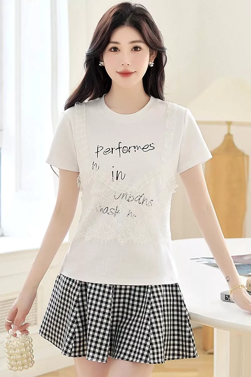 Una t-shirt bianca dallo stile fresco e romantico, ideale per la primavera e l’estate. Realizzata in tessuto leggero e traspirante, è impreziosita da un dettaglio in pizzo applicato sul davanti che dona un tocco femminile e raffinato. La scritta stampata sul petto aggiunge un accento casual e moderno, rendendola perfetta per il tempo libero, un pranzo all’aperto o un look da giorno originale. Il taglio regolare assicura comfort e vestibilità adatta a ogni silhouette. Indossala con una gonna a quadretti o un denim chiaro per un outfit deliziosamente chic. ✨