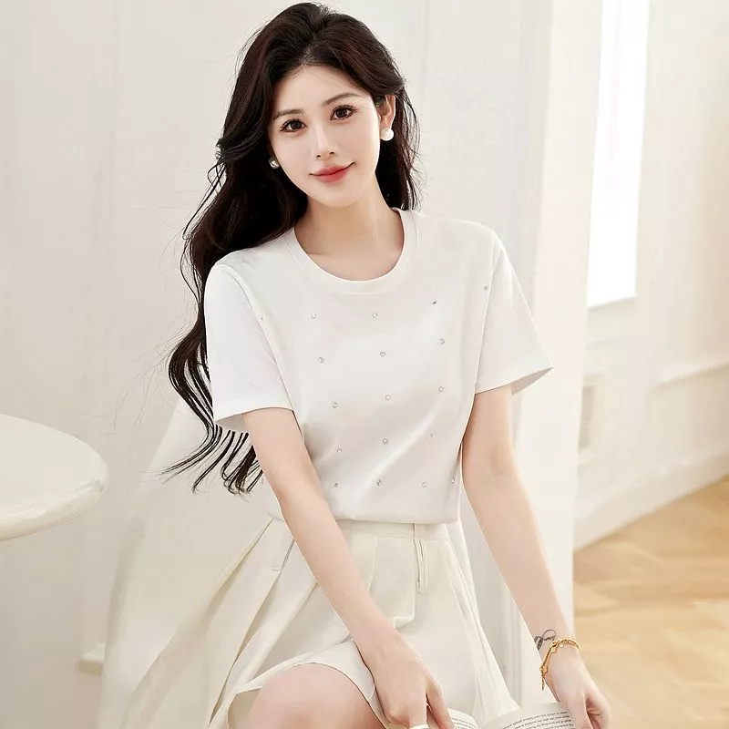 Una t-shirt fresca e raffinata, ideale per la bella stagione. Gli strass decorativi sul davanti aggiungono un tocco di luce e femminilità, mentre il volant in pizzo sul fondo dona movimento e uno stile romantico. Perfetta con gonne a vita alta o pantaloni casual, è il capo versatile da avere per un look elegante ma comodo in ogni occasione.