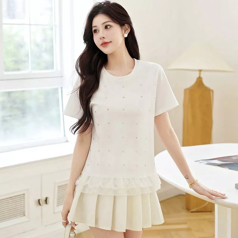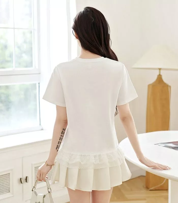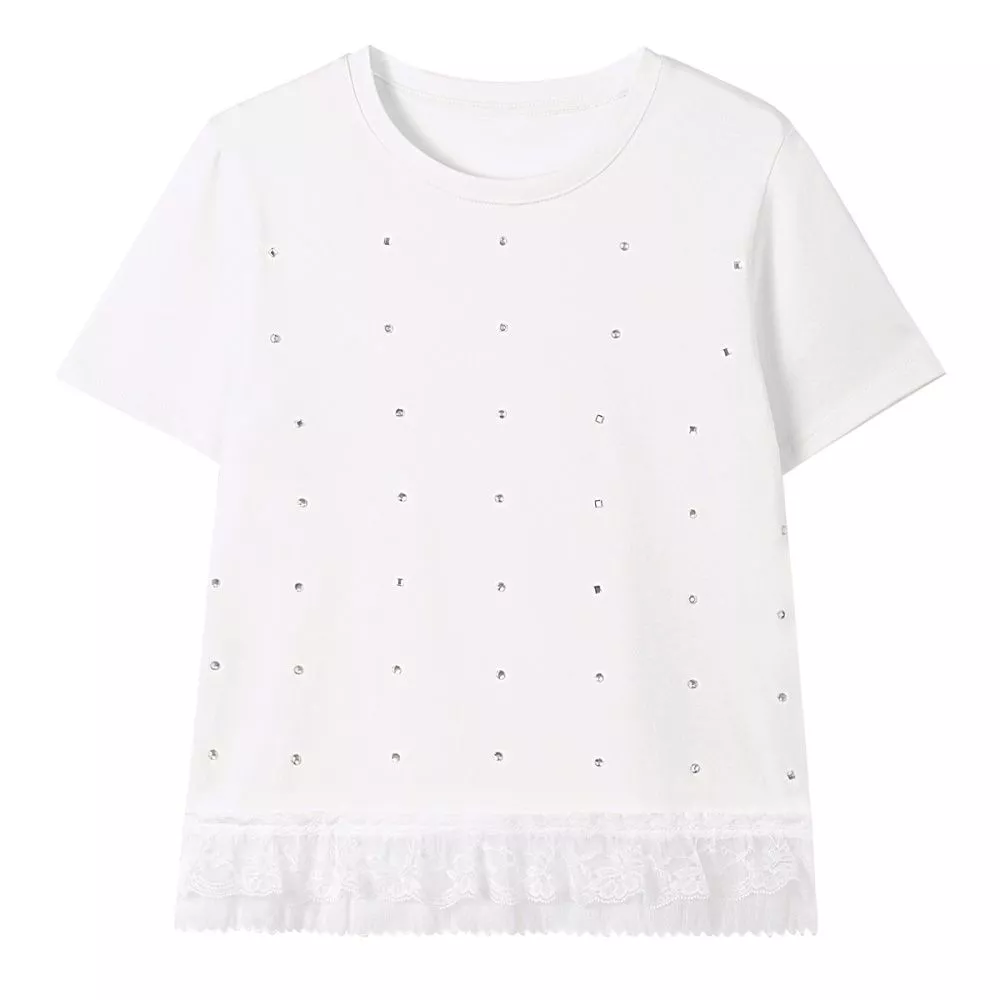 T-Shirt Elegante Con Strass E Volant Pizzo Chic Donna Primavera Estate CF42689