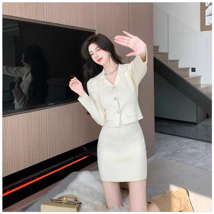 Tailleur Completo Donna Giacca Blazer Set Gonna Elegante Beige Slim 96294