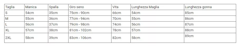 | Taglia | Manica | Spalla | Giro seno | Vita | Lunghezza Maglia | Lunghezza gonna |