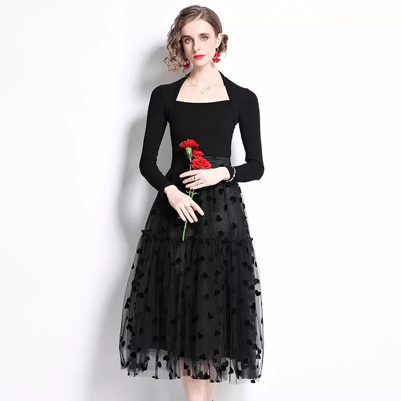 Tailleur completo donna outfit donna maglia scollo bianco nero gonna lunga T172