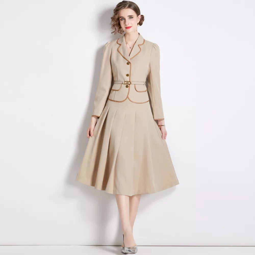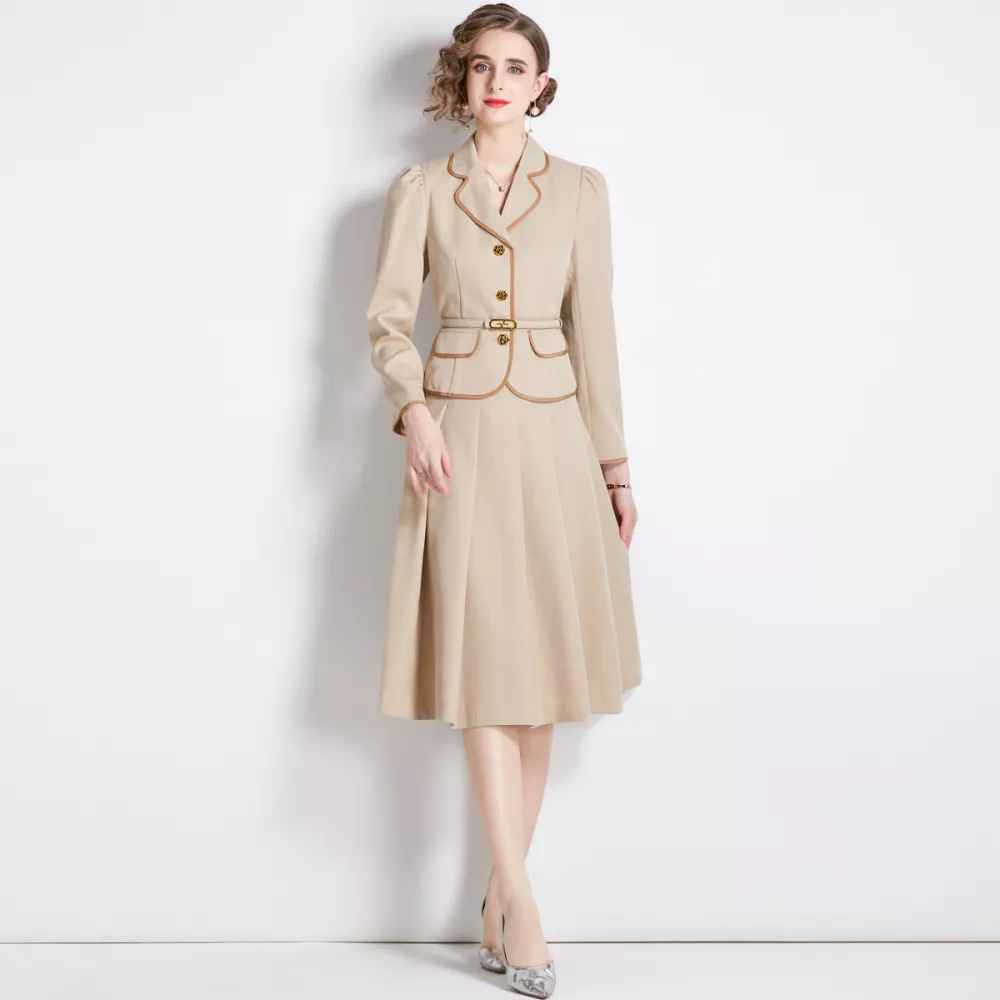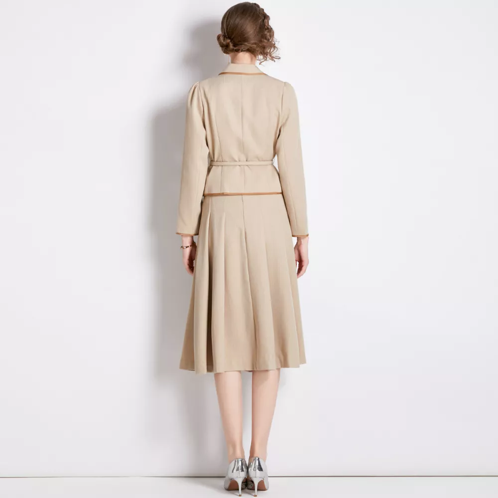 Tailleur Completo Donna Ufficio Giacca Blazer Gonna Lunga Raso Beige 39952