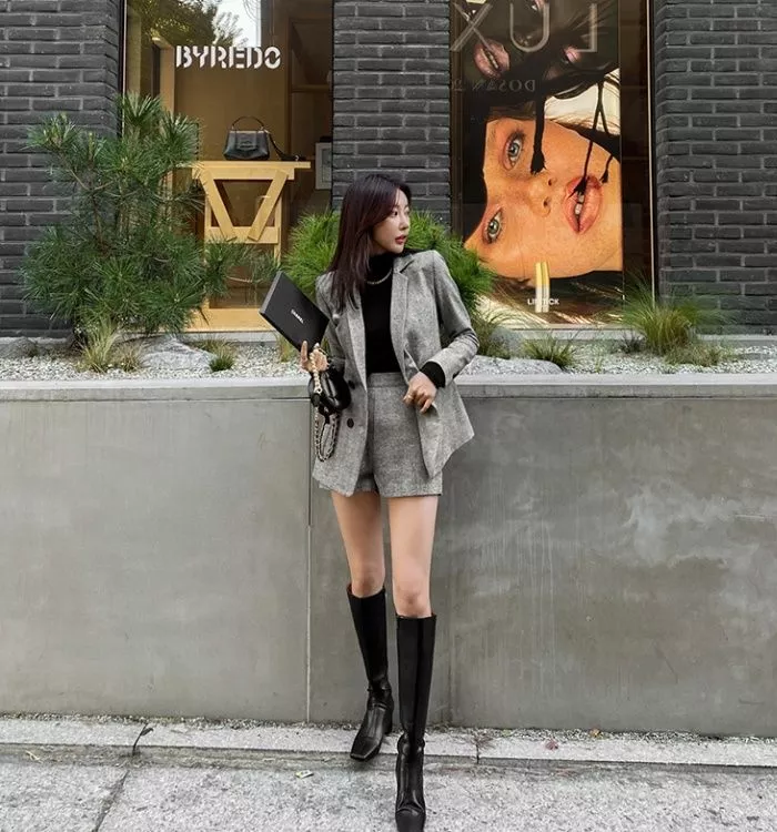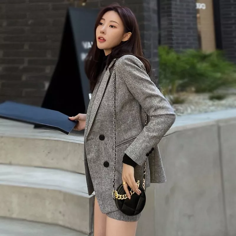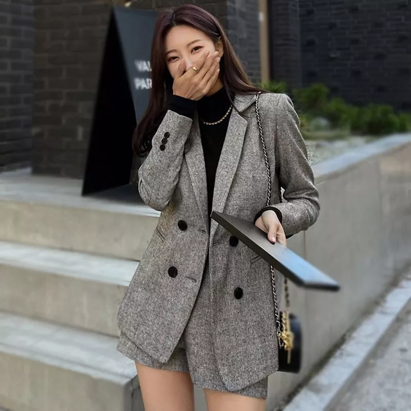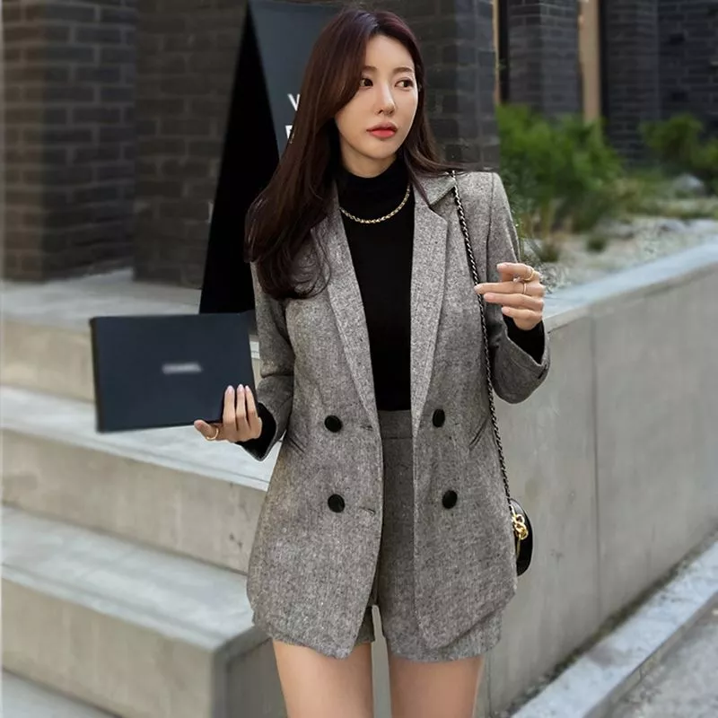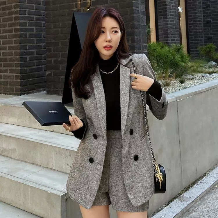 Tailleur Completo Donna Ufficio Giacca Blazer Set Pantaloni Corti Grigio 89126