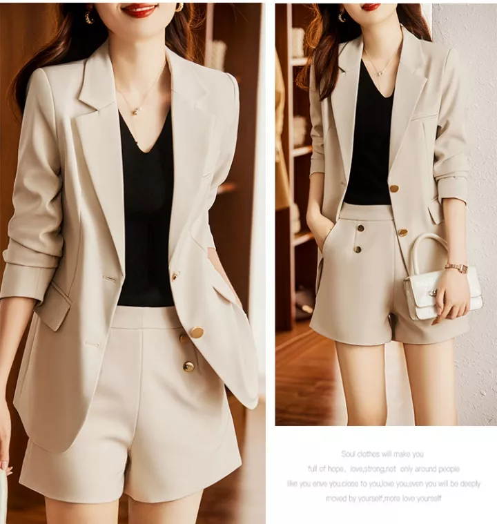 Tailleur Completo Donna Ufficio Set Giacca Blazer Pantaloni Corti Beige 38813
