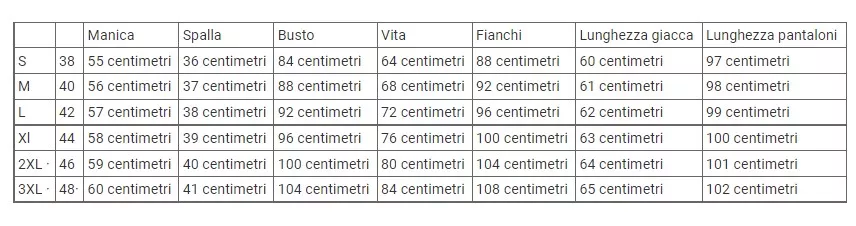 | Manica | Spalla | Busto | Vita | Fianchi | Lunghezza giacca | Lunghezza pantaloni | ||