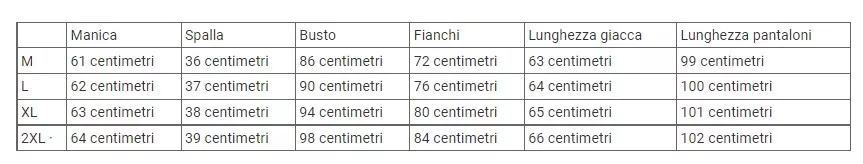 | Manica | Spalla | Busto | Fianchi | Lunghezza giacca | Lunghezza pantaloni | |