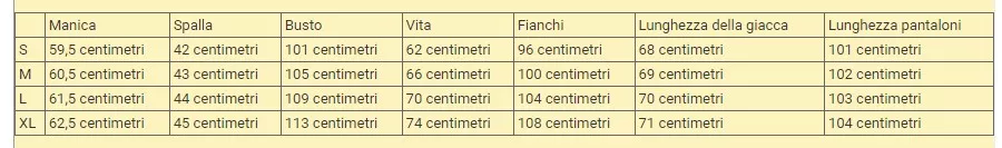 | Manica | Spalla | Busto | Vita | Fianchi | Lunghezza della giacca | Lunghezza pantaloni | |